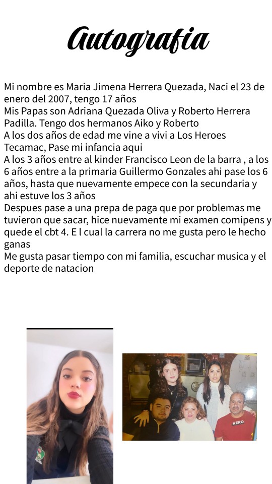 Mi nombre es Maria Jimena Herrera Quezada, Naci el 23 de enero del 2007, tengo 17 años Mis Papas son Adriana Quezada Oliva y Roberto Herrera Padilla. Tengo dos hermanos Aiko y Roberto A los dos años de edad me vine a vivi a Los Heroes Tecamac, Pase mi infancia aqui A los 3 años entre al kinder Francisco Leon de la barra , a los 6 años entre a la primaria Guillermo Gonzales ahi pase los 6 años, hasta que nuevamente empece con la secundaria y ahi estuve los 3 años Despues pase a una prepa de paga que por problemas me tuvieron que sacar, hice nuevamente mi examen comipens y quede el cbt 4. E l cual la carrera no me gusta pero le hecho ganas Me gusta pasar tiempo con mi familia, escuchar musica y el deporte de natacion