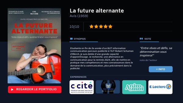 Etudiante en fin de 2e année d'un BUT information communication parcours publicité à l’IUT Robert Schuman d’Illkirch, je suis dotée d'une grande capacité d'apprentissage. Je recherche, une alternance en communication pour la rentrée 2024, afin de mettre en pratique mes compétences et mes connaissances dans le domaine de la communication, plus précisément dans la publicité.