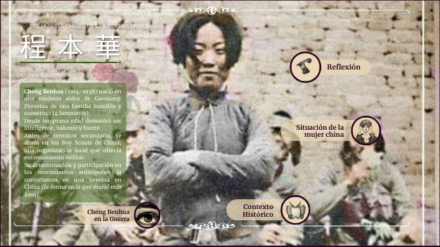 Cheng Benhua (1914-1938) nació en una modesta aldea de Gaoxiang. Provenía de una familia humilde y numerosa (4 hermanos). Desde temprana edad demostró ser inteligente, valiente y fuerte. Antes de terminar secundaria, se alistó en los Boy Scouts de China, una organización local que ofrecía entrenamiento militar. Su determinación y participación en los movimientos antinipones la convirtieron en una heroína en China (la forma en la que murió más bien).