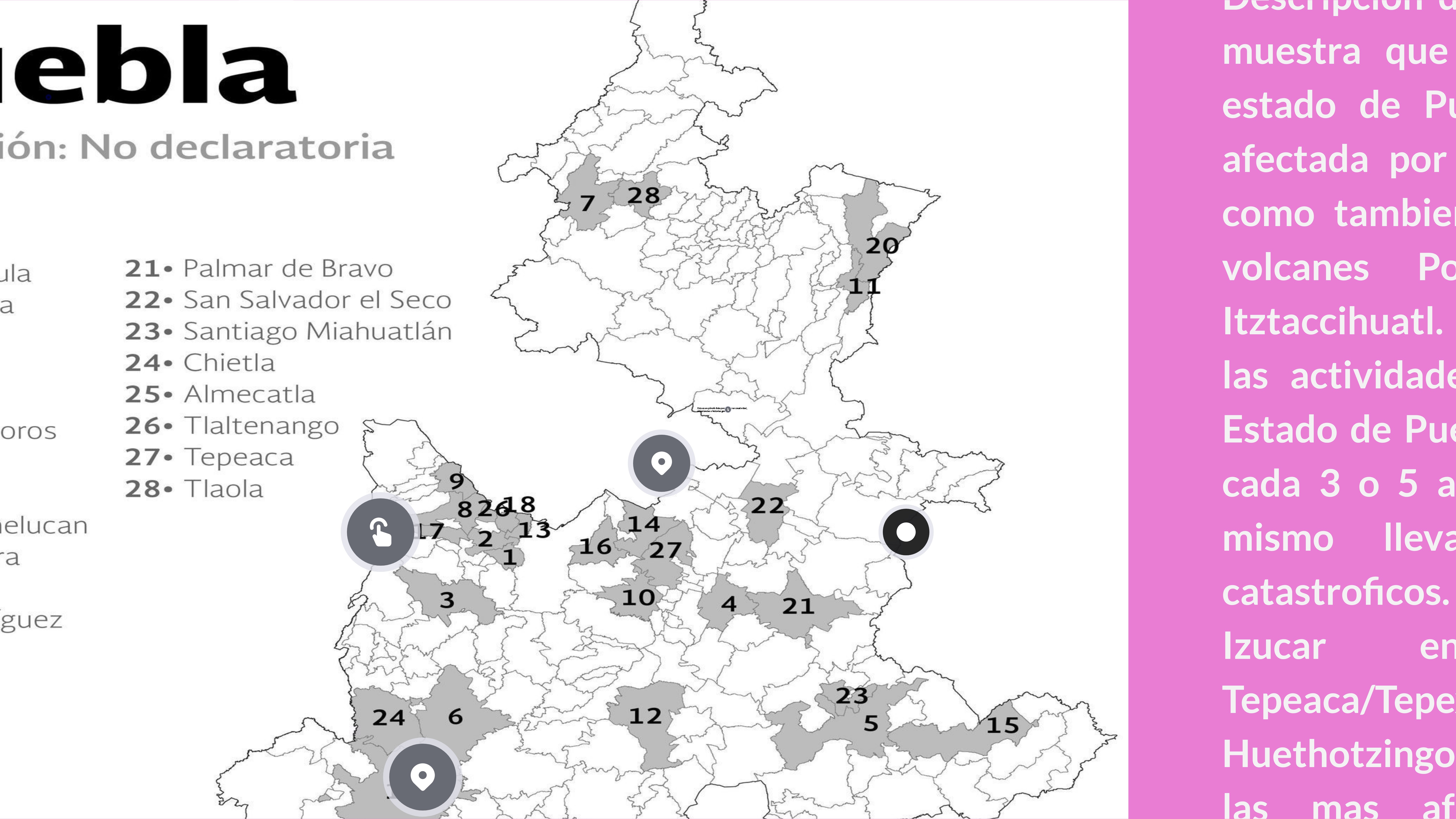 Descripcion del mapa: el mapa muestra que la zona sur del estado de Puebla se ve muy afectada por la sismicidad asi como tambienla region en los volcanes Popocateptel e Itztaccihuatl. La presencia de las actividades sismicas en el Estado de Puebla es constante, cada 3 o 5 años el efecto del mismo lleva a resultados catastroficos. Las regiones del Izucar en Matamoros, Tepeaca/Tepexi, Acatlan, Huethotzingo y Tehuacan son las mas afectadas por el fenomeno