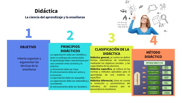 Didáctica general, se centra en definir formas sistemáticas de enseñanza; mediando los objetivos sociales y las capacidades de los alumnos. Didáctica específica, se enfoca en las normas y métodos aplicables para el aprendizaje de una materia en específico. Didáctica diferencial, tiene en cuenta la evolución y características del individuo, de manera que se personalice la enseñanza.