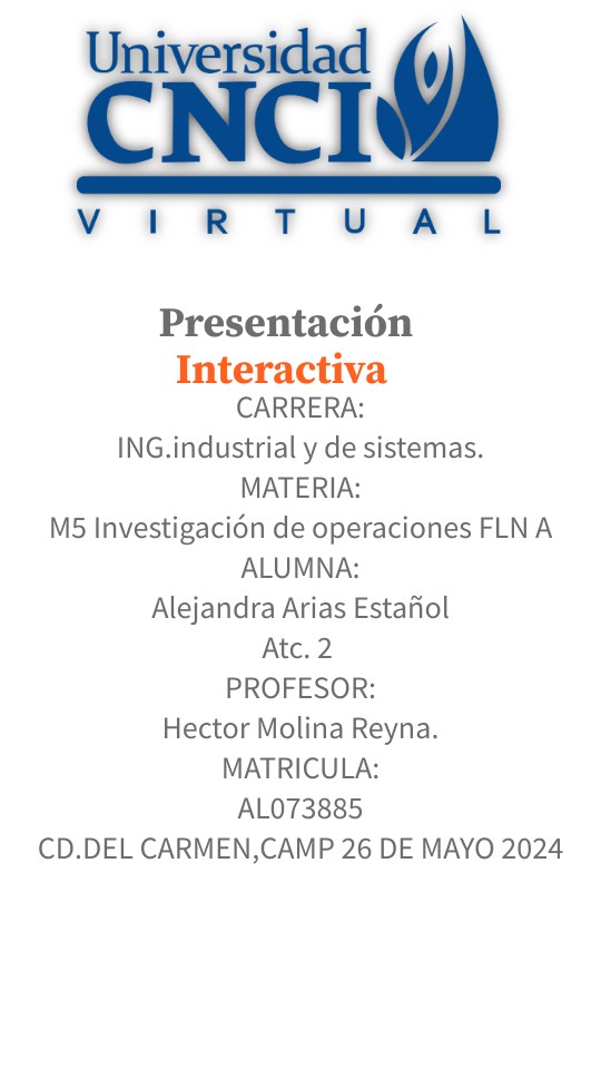 CARRERA: ING.industrial y de sistemas.MATERIA:M5 Investigación de operaciones FLN A ALUMNA: Alejandra Arias Estañol Atc. 2 PROFESOR: Hector Molina Reyna. MATRICULA: AL073885 CD.DEL CARMEN,CAMP 26 DE MAYO 2024