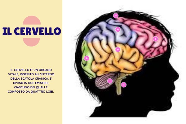 IL CERVELLO E' UN ORGANO VITALE, INSERITO ALL'INTERNO DELLA SCATOLA CRANICA. E' DIVISO IN DUE EMISFERI, CIASCUNO DEI QUALI E' COMPOSTO DA QUATTRO LOBI.