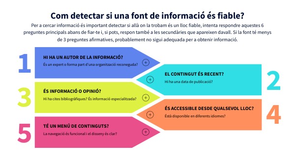 Per a cercar informació és important detectar si allà on la trobam és un lloc fiable, intenta respondre aquestes 6 preguntes principals abans de fiar-te i, si pots, respon també a les secundàries que apareixen davall. Si la font té menys de 3 preguntes afirmatives, probablement no sigui adequada per a obtenir informació.
