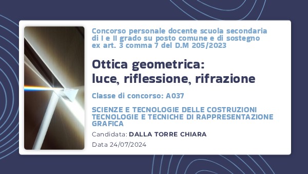 Tema: Ottica geometrica: luce, riflessione, rifrazione Anno: II anno Periodo: II quadrimestre, mesi di aprile/maggio Disciplina: TTRG Interdisciplina: Matematica, Fisica, Scienze Docenti: insegnante curricolare, ITP B017, tecnico Organizzazione temporale: 8 ore