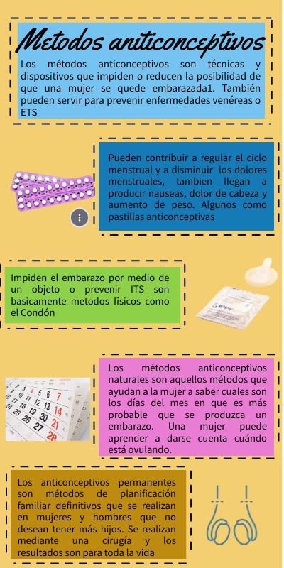 Los métodos anticonceptivos son técnicas y dispositivos que impiden o reducen la posibilidad de que una mujer se quede embarazada1. También pueden servir para prevenir enfermedades venéreas o ETS