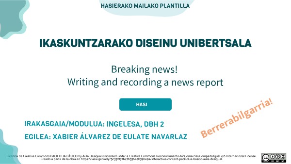 Lan honetan berriak idazten ikasiko dugu, eta berri hoiek grabatuko ditugu, Teleberrin arituko bagina bezala. Ikusi al duzu inoiz Teleberri? Gure inguruko berriak asmatuko eta sortuko ditugu, eta gero bideo batean grabatuko ditugu, profesionalek egiten duten bezala. 3 berri idatzi behar ditugu: Natural disasters, Crime eta Emergencies gaiak landuz. Horretarako, ikasitako hiztegia eta gramatika erabili behar dugu. Prest zaude?