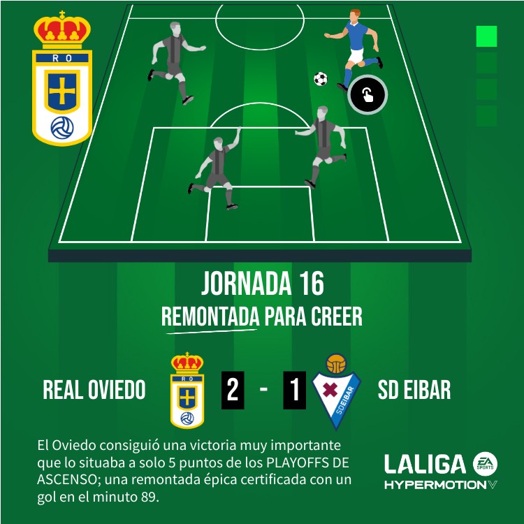 El Oviedo consiguió una victoria muy importante que lo situaba a solo 5 puntos de los PLAYOFFS DE ASCENSO; una remontada épica certificada con un gol en el minuto 89.