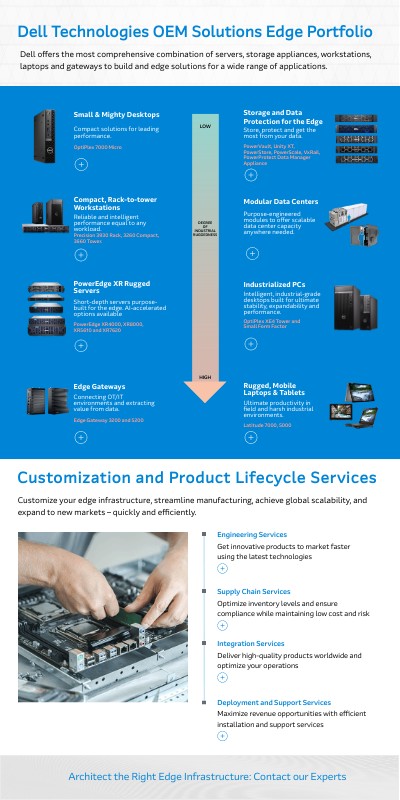 Dell offers the most comprehensive combination of servers, storage appliances, workstations, laptops and gateways to build and edge solutions for a wide range of applications.