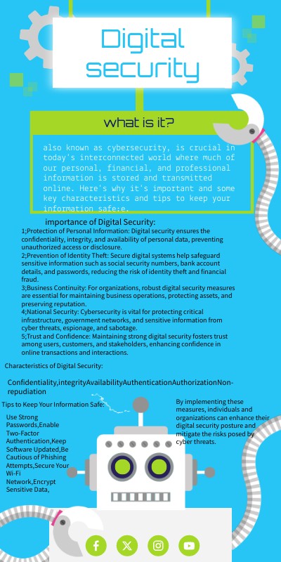 1;Protection of Personal Information: Digital security ensures the confidentiality, integrity, and availability of personal data, preventing unauthorized access or disclosure.2;Prevention of Identity Theft: Secure digital systems help safeguard sensitive information such as social security numbers, bank account details, and passwords, reducing the risk of identity theft and financial fraud. 3;Business Continuity: For organizations, robust digital security measures are essential for maintaining business operations, protecting assets, and preserving reputation. 4;National Security: Cybersecurity is vital for protecting critical infrastructure, government networks, and sensitive information from cyber threats, espionage, and sabotage. 5;Trust and Confidence: Maintaining strong digital security fosters trust among users, customers, and stakeholders, enhancing confidence in online transactions and interactions.