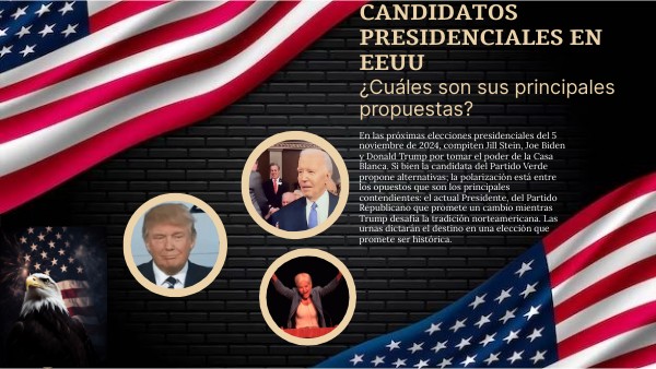 En las próximas elecciones presidenciales del 5 noviembre de 2024, compiten Jill Stein, Joe Biden y Donald Trump por tomar el poder de la Casa Blanca. Si bien la candidata del Partido Verde propone alternativas; la polarización está entre los opuestos que son los principales contendientes: el actual Presidente, del Partido Republicano que promete un cambio mientras Trump desafía la tradición norteamericana. Las urnas dictarán el destino en una elección que promete ser histórica.
