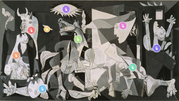 Al centre, hi ha un cavall ferit per una espasa amb la boca oberta fent un crit del mal. Representa el sofriment del poble espanyol.