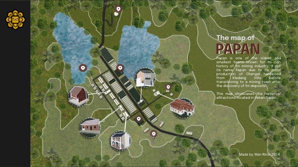 Papan is one of the oldest and smallest towns known for its rich history of tin mining industry. It got its name Papan due to its initial production of Chengal hardwood from Kledang Hills before transitioning to a mining town after the discovery of tin deposits. This map showcases the historical attractions located in Pekan Papan.