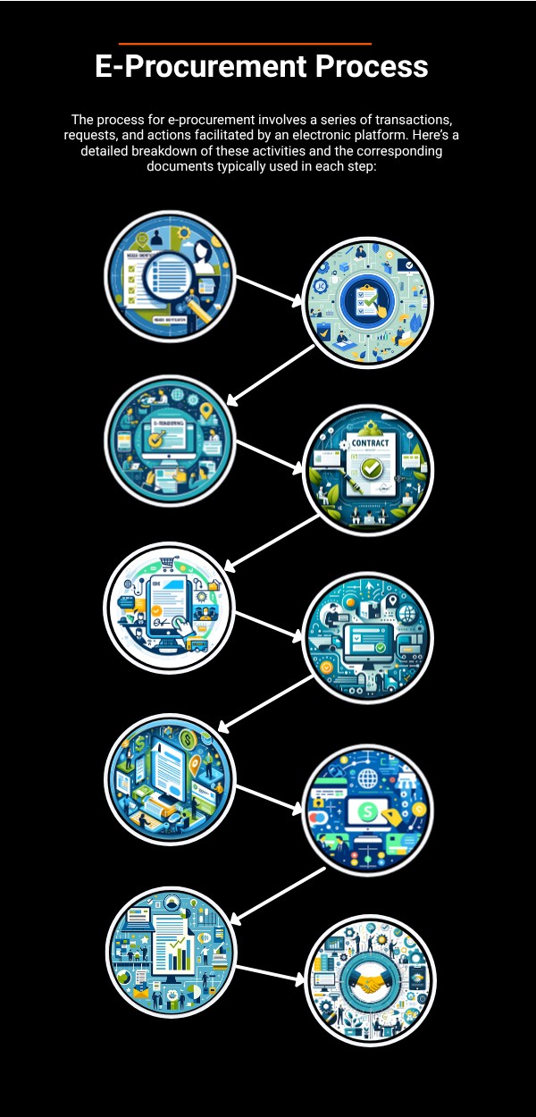 The process for e-procurement involves a series of transactions, requests, and actions facilitated by an electronic platform. Here’s a detailed breakdown of these activities and the corresponding documents typically used in each step: