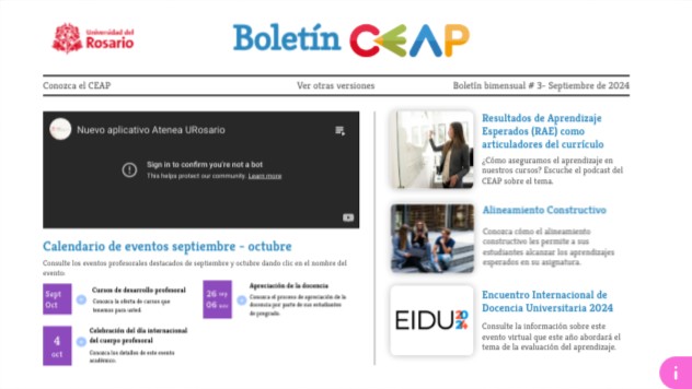 El Encuentro Internacional de Docencia Universitaria (EIDU) es una iniciativa anual coordinada por el Departamento de Docencia Universitaria de la Universidad de Costa Rica y por el CEAP de la Universidad del Rosario. El EIDU 2024 se realizará el jueves 10 de octubre de 9:00 a 1:30 p.m. Será un encuentro virtual y gratuito que este año abordará el tema de la evaluación del aprendizaje y contará con conferencias, talleres y vitrinas de buenas prácticas compartidas por profesores de diferentes instituciones de Latinoamérica.Este año la conferencista central será Katherina Gallardo, Decana Regional de la Escuela de Humanidades y Educación del Tecnológico de Monterrey, quien compartirá sus indagaciones y reflexiones sobre los retos y mejores prácticas en el desarrollo de competencias docentes para evaluar el aprendizaje.