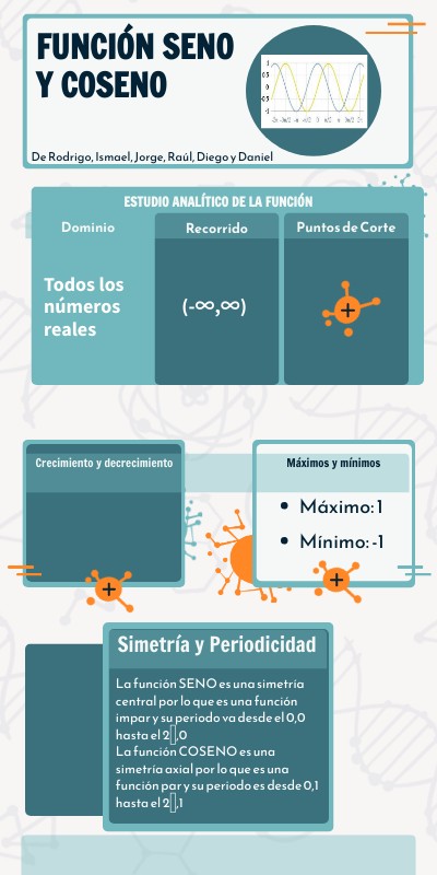 La función SENO es una simetría central por lo que es una función impar y su periodo va desde el 0,0 hasta el 2𝛑,0La función COSENO es una simetría axial por lo que es una función par y su periodo es desde 0,1 hasta el 2𝛑,1