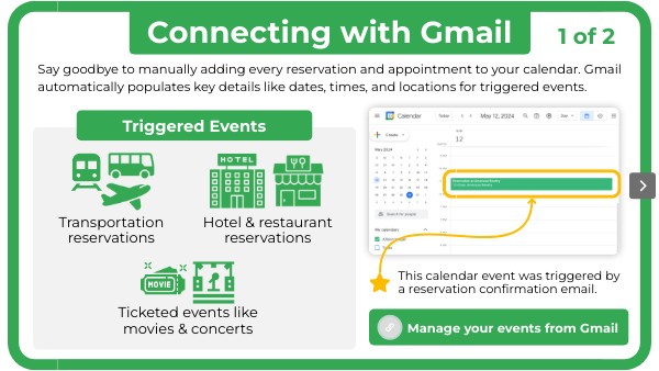 Say goodbye to manually adding every reservation and appointment to your calendar. Gmail automatically populates key details like dates, times, and locations for triggered events.