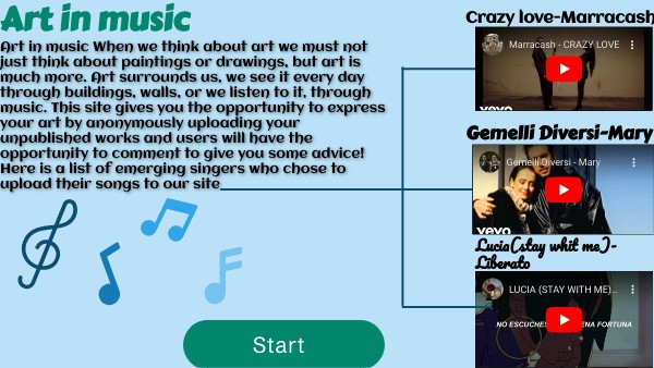 Art in music When we think about art we must not just think about paintings or drawings, but art is much more. Art surrounds us, we see it every day through buildings, walls, or we listen to it, through music. This site gives you the opportunity to express your art by anonymously uploading your unpublished works and users will have the opportunity to comment to give you some advice! Here is a list of emerging singers who chose to upload their songs to our site