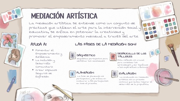 La mediación artística se entiende como un conjunto de prácticas que utilizan el arte para la intervención social y educativa, se enfoca en potenciar la creatividad y promover el empoderamiento individual a través del arte
