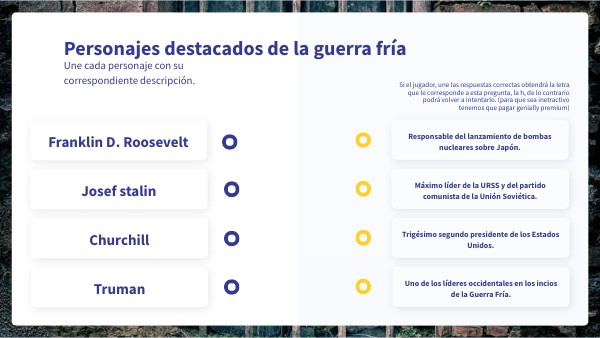 Si el jugador, une las respuestas correctas obtendrá la letra que le corresponde a esta pregunta, la h, de lo contrario podrá volver a intentarlo. (para que sea inetractivo tenemos que pagar genially premium)