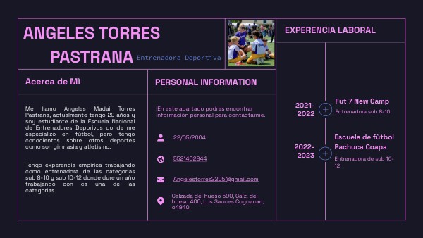 Me llamo Angeles Madai Torres Pastrana, actualmente tengo 20 años y soy estudiante de la Escuela Nacional de Entrenadores Deporivos donde me especializo en fùtbol, pero tengo conocientos sobre otros deportes como son gimnasia y atletismo. Tengo experencia empirica trabajando como entrenadora de las categorias sub 8-10 y sub 10-12 donde dure un año trabajando con ca una de las categorias.