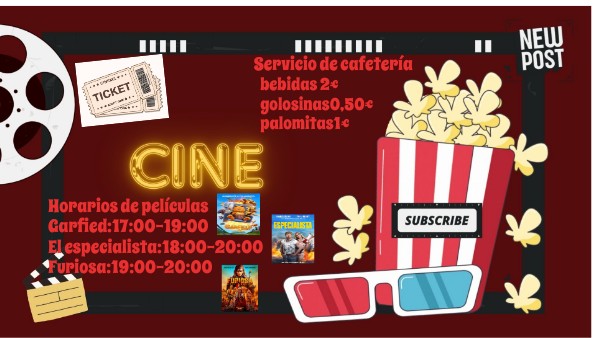 Horarios de películas Garfied:17:00-19:00 El especialista:18:00-20:00 Furiosa:19:00-20:00