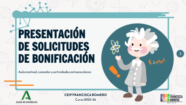 La solicitud de bonificación han de presentarla todas las familias que en junio solicitaron aula matinal, comedor o actividades extraescolares (www.ceipvalmecoronada.es) y deseen recibir una ayuda económica de la Junta de Andalucía.Será obligatorio para los que tienen garantizada la gratuidad del servicio, excepto los SYGAS.