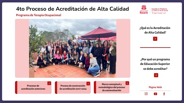 En la siguiente imagen se presenta la línea de tiempo de los cuatro procesos de acreditación que ha realizado el programa de Terapia Ocupacional desde 2007, sustentados en los lineamientos del Consejo Nacional de Acreditación del Ministerio de Educación Nacional de Colombia.