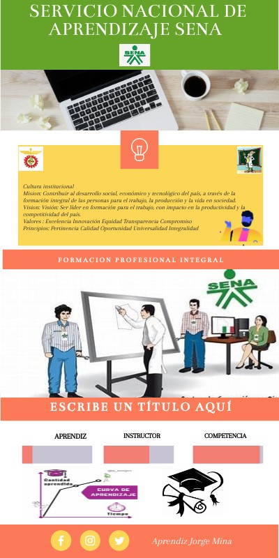 Cultura institucionalMision: Contribuir al desarrollo social, económico y tecnológico del país, a través de la formación integral de las personas para el trabajo, la producción y la vida en sociedad. Vision: Visión: Ser líder en formación para el trabajo, con impacto en la productividad y la competitividad del país. Valores : Excelencia Innovación Equidad Transparencia Compromiso Principios: Pertinencia Calidad Oportunidad Universalidad Integralidad
