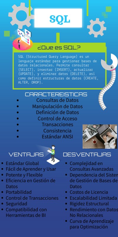 SQL (Structured Query Language) es un lenguaje estándar para gestionar bases de datos relacionales. Permite consultar (SELECT), insertar (INSERT), actualizar (UPDATE), y eliminar datos (DELETE), así como definir estructuras de datos (CREATE, ALTER, DROP).