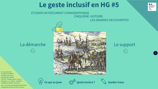 Voici une activité utilisée en classe de cinquième dans le cadre du thème 3 du programme d’Histoire : “Transformations de l’Europe et ouverture sur le monde aux XVIème et XVIIème siècles”. L’intention est de permettre aux élèves de comprendre la portée d’un document iconographique - réalisé a postériori de la découverte des Antilles par Christophe Colomb, dans un contexte européen meurtri par les guerres de religion. Ce document se veut donc à la croisée de la première et de la seconde séquence du dernier thème d’histoire de l’année. La description sur laquelle les élèves auront à se pencher doit permettre de remobiliser les connaissances concernant les découvertes et conquêtes européennes, tout en permettant d’interroger l'arrière-plan droit de la gravure (un siècle après la découverte du continent américain, le protestant Théodore de Bry dénonce la politique des royaumes catholiques sur les terres conquises un siècle plus tôt). Nous proposons de faire analyser ce document par les élèves à la fin de la première séquence consacrée au “Monde au temps de Charles Quint et de Soliman le Magnifique”, séquence dans laquelle les élèves auront découvert les motivations et les conditions des découvertes européennes. La consigne de travail associée est la suivante : "Décris cette gravure afin d'identifier une chronologie des événements présentés. Formule ensuite une hypothèse : quel est le message de l'auteur Théodore de Bry ?". A la fin de la séance, les élèves devront avoir réinvesti les savoirs acquis sur l'expansion européenne dans le cadre des Grandes Découvertes, et questionné l'intention de l'auteur de la gravure : décrire l'arrivée de Christophe Colomb aux Antilles (vision réaliste du document), ou exprimer un point de vue sur les conditions dans lesquelles l'expansion européenne s'est déroulée ? C'est alors l'enseignant qui reprend la parole pour expliquer l'intention de l'auteur et le contexte dans lequel il a produit la gravure. Cette explication permet la transition avec le chapitre suivant : "Humanisme, réformes et conflits religieux".