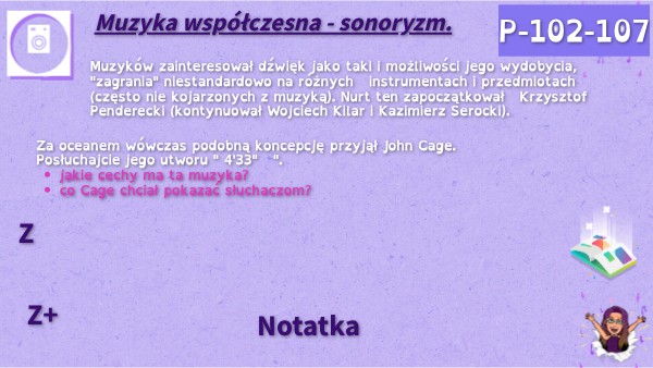 Za oceanem wówczas podobną koncepcję przyjął John Cage. Posłuchajcie jego utworu " 4'33" ".- jakie cechy ma ta muzyka?