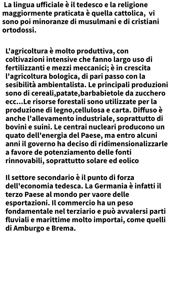 Tutto il territorio della Germania è attraversato da grandi fiumi navigabili, collegati tra loro da una fitta rete di canali artificiali. A ovest il Reno segna il confine con la Francia, fino ai Pesi Bassi. Un afluente importante è il Meno. Il Danubio nasce nella Selva Nera e procede con un'ampia vallata lungo la Baviera. Il Weser e l'Elba percorrono con larghe anse la regione settentrionale e si gettano nel Mare del Nord; l'Oder segna per un lungo ratto il confine con la Polonia. Al confine con la Svizzera si trova l'ampio lago di Costanza. Il clima è influenzato dalla presenza del mare: quindi vicino la costa è atlanico; nella parte più a sud è continentale. La vegetazione è caratterizzata dai boschi di latifoglie a nord-ovest e dalla brughiera sul Batico. La germania è una federazione di 16 stati con proprie istituzioni e ampie autonomie decisionali. Ogni Land è rappresentato nel Consiglio federale. Il governo è guidato da un cancelliere, capo del potere esecutivo, mentre il parlamento detiene il potere legislativo. Il capo dello Stato federale è il Presidente, che rappresenta l'unità della nazione e ha funzioni di garanzia. Oltre il 75% della popolazione tedesca risiede in città. La Germania è meta di un forte flusso di migranti dall'estero (turchi,polacchi,italiani,rumeni,greci ecc...) e dall'interno, provenienti soprattutto dai Lander orientali, più poveri e meno industrializzati.