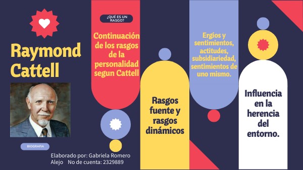 Cattell postuló que la personalidad y la inteligencia son el resultado de la interacción entre la herencia génetica y el entorno en el que una persona se desarrolla.Infancia (Nacimiento - 6 años): Es el principal periodo formativo de la personalidad, las acctitudes sociales se desarrolllan al mismo tiempo que el yo, el superyó, el sentimiento de seguridad o de inseguridad, las actitudes hacia la autoridad. Niñez (6 - 14 años): Este periodo marca el incio de una tedencia a independizarse de los padres y identificarse mas con los coetáneos. Adolescencia (12 - 23 años): Los transtornos emocionales y la delincuencia pueden surgir, cuando los jóvenes experimentan conflictos que se centran en la independencia. Madurez (23 - 50 años): Puede ser productiva y satisfactoria en lo que respecta a la carrera, el matrimonio y la vida familiar. Madurez tardia (50 - 65 años): Se dan cambios de la personalidad ante circunstacias físicas y sociales, pueden disminuir la salud, la fuerza y el atractivo. Vejez (65 años - muerte): Sobreviene un sentido generalizado de soledad e inseguridad.