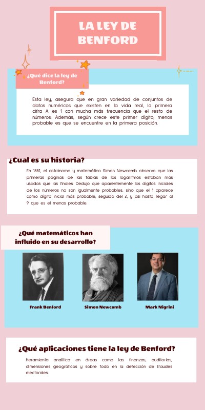 Esta ley, asegura que en gran variedad de conjuntos de datos numéricos que existen en la vida real, la primera cifra A es 1 con mucha más frecuencia que el resto de números. Además, según crece este primer dígito, menos probable es que se encuentre en la primera posición.