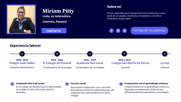 Comprometida con el aprendizaje continuo y dispuesta a mantenerme al día con las últimas tendencias educativas y tecnologías.