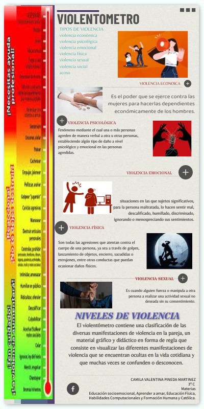 El violentómetro contiene una clasificación de las diversas manifestaciones de violencia en la pareja, un material gráfico y didáctico en forma de regla que consiste en visualizar las diferentes manifestaciones de violencia que se encuentran ocultas en la vida cotidiana y que muchas veces se confunden o desconocen.