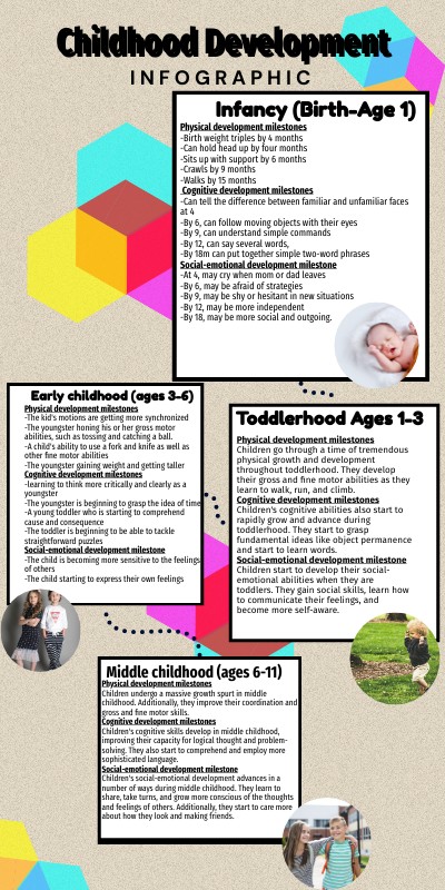 Physical development milestones -Birth weight triples by 4 months -Can hold head up by four months -Sits up with support by 6 months -Crawls by 9 months -Walks by 15 months Cognitive development milestones -Can tell the difference between familiar and unfamiliar faces at 4 -By 6, can follow moving objects with their eyes -By 9, can understand simple commands -By 12, can say several words, -By 18m can put together simple two-word phrases Social-emotional development milestone -At 4, may cry when mom or dad leaves -By 6, may be afraid of strategies -By 9, may be shy or hesitant in new situations -By 12, may be more independent -By 18, may be more social and outgoing.