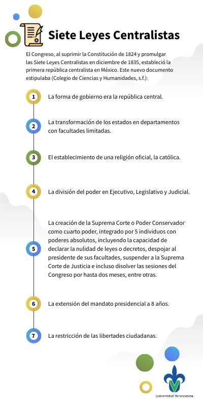 El Congreso, al suprimir la Constitución de 1824 y promulgar las Siete Leyes Centralistas en diciembre de 1835, estableció la primera república centralista en México. Este nuevo documento estipulaba (Colegio de Ciencias y Humanidades, s.f.):