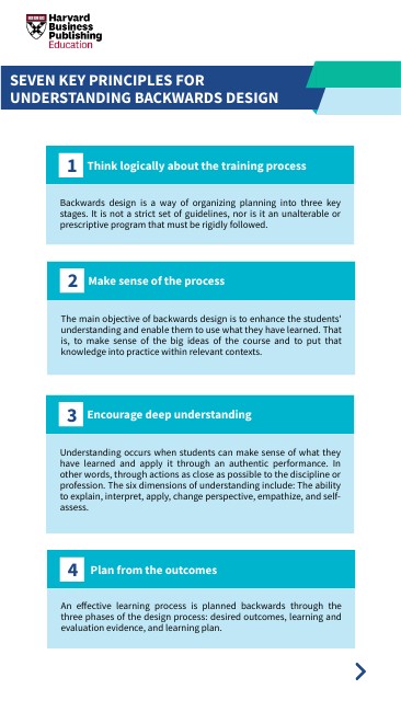 Backwards design reflects a continuous improvement approach that aims to achieve knowledge acquisition through design, planning, and engaged learning in training. Basically, it reflects an approach on improving the performance of the student.