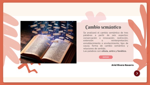 Se analizará el cambio semántico de tres palabras a partir de seis aspectos: conservación o innovación; restricción, extensión o reinterpretación; ennoblecimiento o envilecimiento; tipo de causa; forma de cambio semántico y relaciones de sentido. Las palabras son célula, antro y fanático.