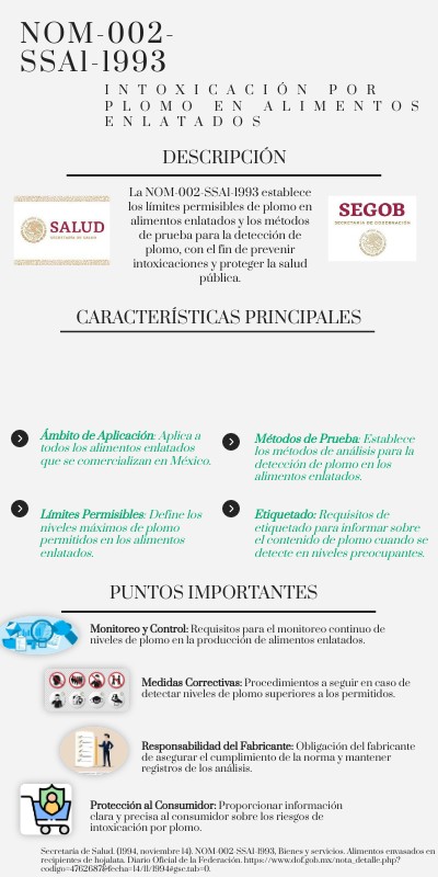 La NOM-002-SSA1-1993 establece los límites permisibles de plomo en alimentos enlatados y los métodos de prueba para la detección de plomo, con el fin de prevenir intoxicaciones y proteger la salud pública.