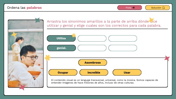 Arrastra los sinonimos amarillos a la parte de arriba dónde dice utilizar y genial y elige cuales son los correctos para cada palabra.