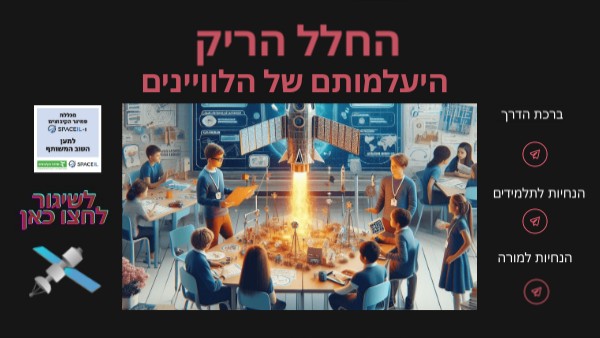 !ברוכים הבאים לפעילות החינוכית שלנו על חלל ולווינים במסע המרתק הזה נחקור יחד את השאלה: מה יקרה אם ?כל הלוויינים שאנחנו משתמשים בהם יעלמו פתאום דרך ארבע תחנות, תלמדו על סוגי הלוויינים, מסלולי הלווינים, חשיבות הלווינים וההשפעות של היעלמותם. בכל תחנה מצפה לכם פעילות אינטראקטיבית (סרטון/ חידון/משחק / בניית דגם). התקדמו בנתיב בדרך שלכם וגלו את הלוויינים השונים שהאנושות משתמשת בהם !תתכוננו לחוויה מהנה ומלמדת