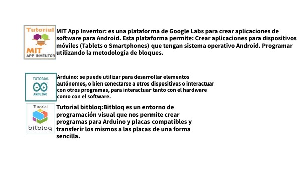 MIT App Inventor: es una plataforma de Google Labs para crear aplicaciones de software para Android. Esta plataforma permite: Crear aplicaciones para dispositivos móviles (Tablets o Smartphones) que tengan sistema operativo Android. Programar utilizando la metodología de bloques.