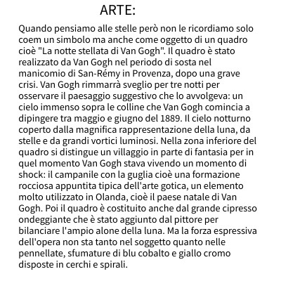 Quando pensiamo alle stelle però non le ricordiamo solo coem un simbolo ma anche come oggetto di un quadro cioè "La notte stellata di Van Gogh". Il quadro è stato realizzato da Van Gogh nel periodo di sosta nel manicomio di San-Rémy in Provenza, dopo una grave crisi. Van Gogh rimmarrà sveglio per tre notti per osservare il paesaggio suggestivo che lo avvolgeva: un cielo immenso sopra le colline che Van Gogh comincia a dipingere tra maggio e giugno del 1889. Il cielo notturno coperto dalla magnifica rappresentazione della luna, da stelle e da grandi vortici luminosi. Nella zona inferiore del quadro si distingue un villaggio in parte di fantasia per in quel momento Van Gogh stava vivendo un momento di shock: il campanile con la guglia cioè una formazione rocciosa appuntita tipica dell'arte gotica, un elemento molto utilizzato in Olanda, cioè il paese natale di Van Gogh. Poi il quadro è costituito anche dal grande cipresso ondeggiante che è stato aggiunto dal pittore per bilanciare l'ampio alone della luna. Ma la forza espressiva dell'opera non sta tanto nel soggetto quanto nelle pennellate, sfumature di blu cobalto e giallo cromo disposte in cerchi e spirali.