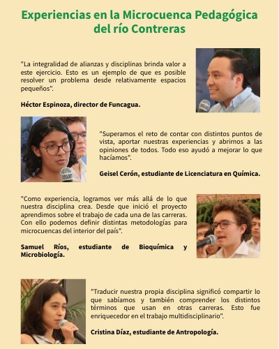 "Como experiencia, logramos ver más allá de lo que nuestra disciplina crea. Desde que inició el proyecto aprendimos sobre el trabajo de cada una de las carreras. Con ello podemos definir distintas metodologías para microcuencas del interior del país". Samuel Ríos, estudiante de Bioquímica y Microbiología.