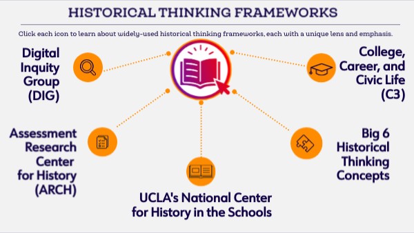 Click each icon to learn about widely-used historical thinking frameworks, each with a unique lens and emphasis.