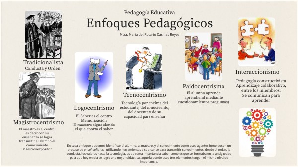 En cada enfoque podemos identificar al alumno, al maestro, y al conocimiento como esos agentes inmersos en un proceso de enseñseñanza, utilizando herramientas a su alcance para transmitir conocimientos, desde el orden, la conducta, los valores hasta la tecnologia, es de suma importancia saber como es que se formaba en la antiguedad para que hoy en dia se logre una mejor didáctica, aquella donde esos tres elementos tengan el mismo nivel de importancia.