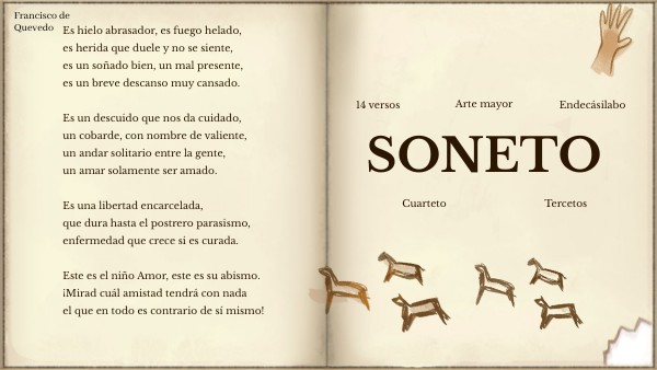 Es hielo abrasador, es fuego helado, es herida que duele y no se siente, es un soñado bien, un mal presente, es un breve descanso muy cansado. Es un descuido que nos da cuidado, un cobarde, con nombre de valiente, un andar solitario entre la gente, un amar solamente ser amado. Es una libertad encarcelada, que dura hasta el postrero parasismo, enfermedad que crece si es curada. Este es el niño Amor, este es su abismo. ¡Mirad cuál amistad tendrá con nada el que en todo es contrario de sí mismo!